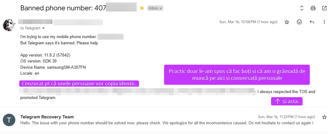 E posibil să încheie munca pe la 23:00 pentru că după am mai trimis și legat de alte 2 conturi de-ale mele banate și la alea nu e nicio reacție încă. Și ca reply la mesajul lor, și separat.
